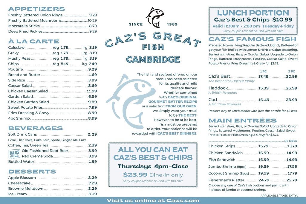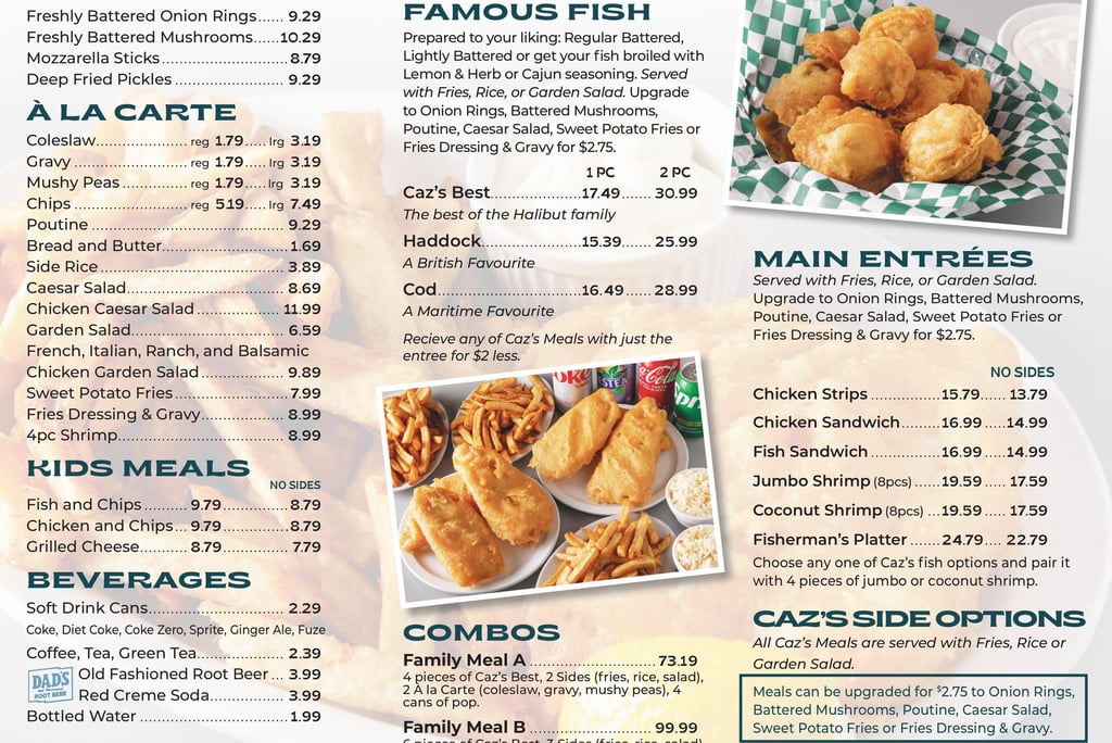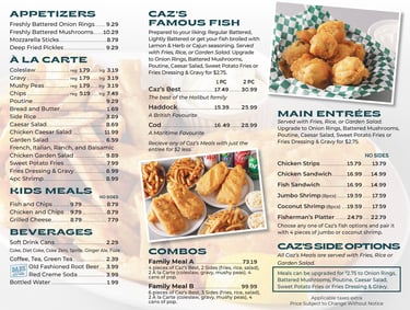 Explore our extensive dining room menu to discover the delicious options available when you visit us at Caz's Great Fish. From appetizers to main courses, we offer a variety of dishes to satisfy every palate. Take your time to decide what you'll enjoy on your next visit!